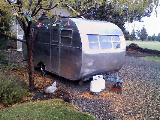 | The 1950 Traveleze safe and dry behind the shop. |